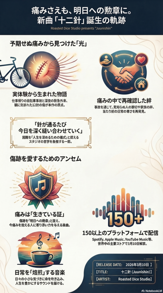 人生という盤面において、私たちは常に最善の「手」を指そうと努めます。しかし、時に運命のダイスは、私たちの予想もしない目を示します。Roasted Dice Studioが放つ最新シングル『十二針』は、そんな予期せぬ転換点=「痛み」を、単なる不運として片付けるのではなく、人生をより深く、力強く編み上げるための「聖なる儀式」へと昇華させた物語です。