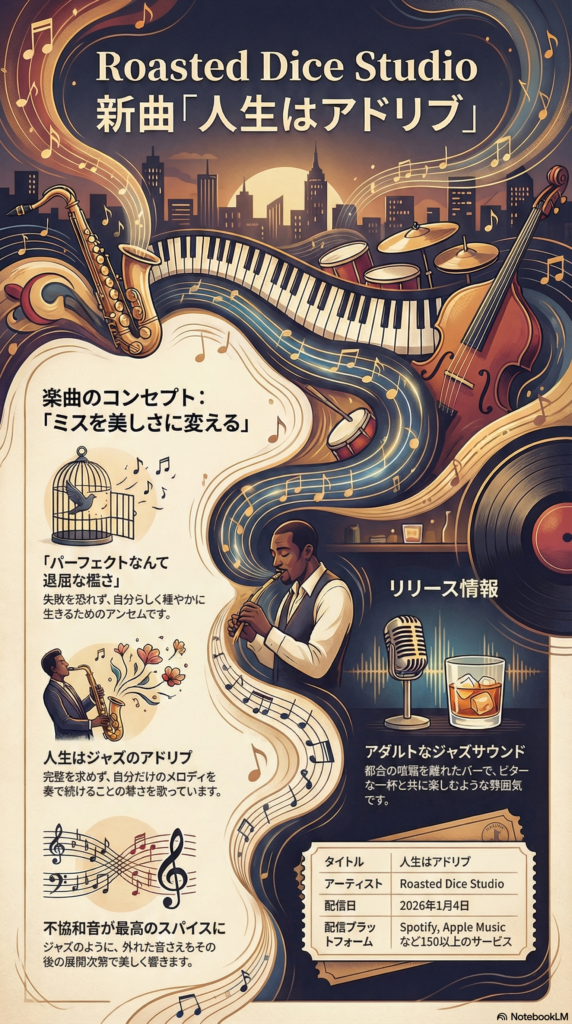 完璧でなければならない──。そんな見えないプレッシャーに、心がすくんでしまった経験はないだろうか。計画通りに進まない日々に、つい立ち止まってしまいそうになる瞬間。そんな時、私たちの耳に、そして心に届く一曲がある。Roasted Dice Studioが放つ新曲『人生はアドリブ』だ。