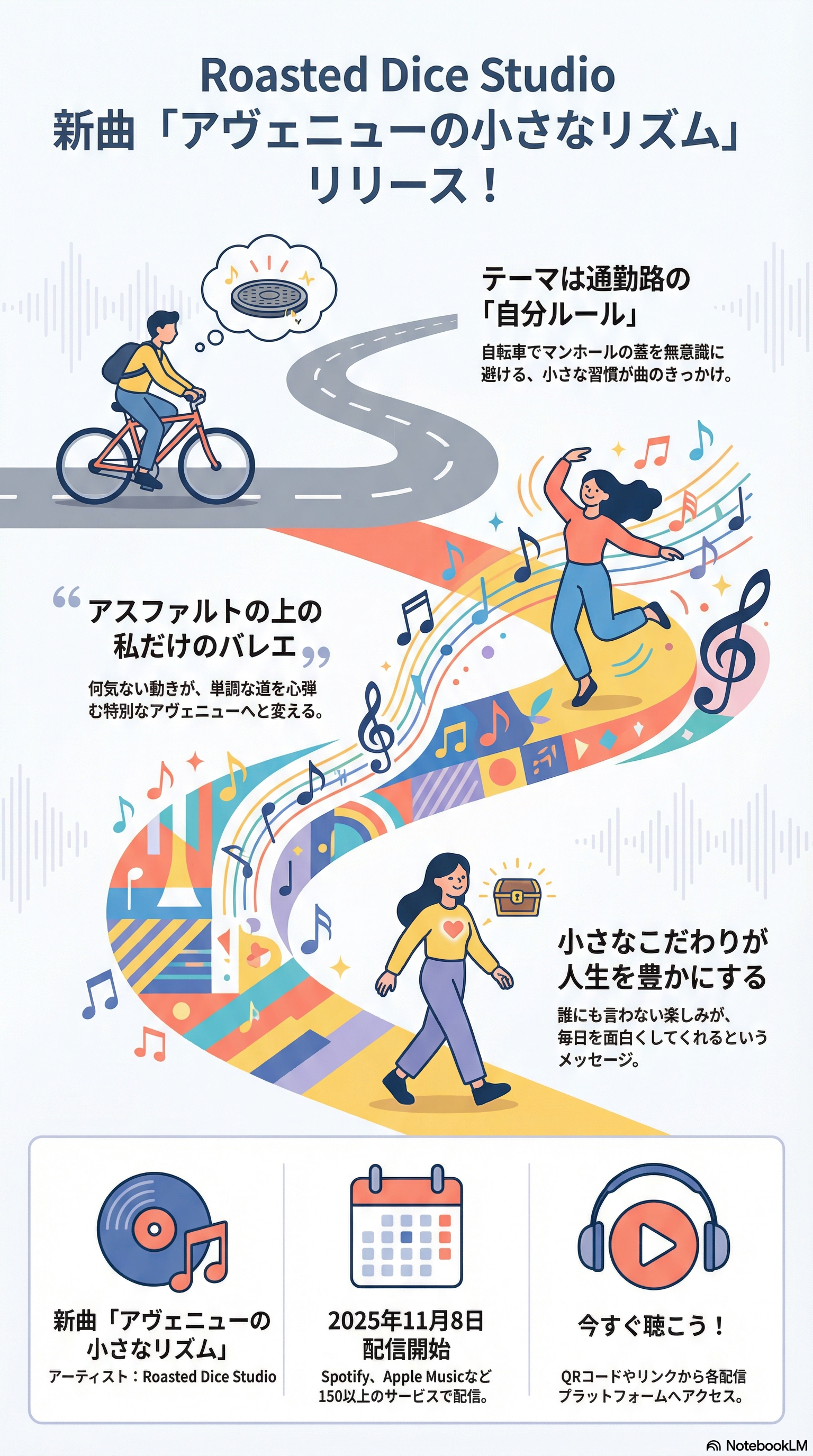 Roasted Dice Studioから、通算81作目となる新しいシングル「アヴェニューの小さなリズム」が届けられました。この曲は、私たちが毎日を過ごすありふれた風景の中に、実は特別な喜びや魔法が隠されていることを教えてくれます。