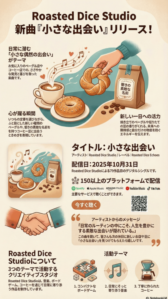 忙しい毎日の中で、ふと心が軽くなる瞬間はありますか?Roasted Dice Studioの新曲「小さな出会い」は、そんな日常のささいな出来事の中に隠された喜びや豊かさを見つけるための、優しいガイドのような一曲です。まるで休日の朝、丁寧にハンドドリップで淹れた一杯のコーヒーのように、その豊かな香りと温もりがじんわりと心に広がる…そんな一曲が、あなたの心にそっと寄り添い、何気ない一日を特別なものに変えるきっかけをくれます。