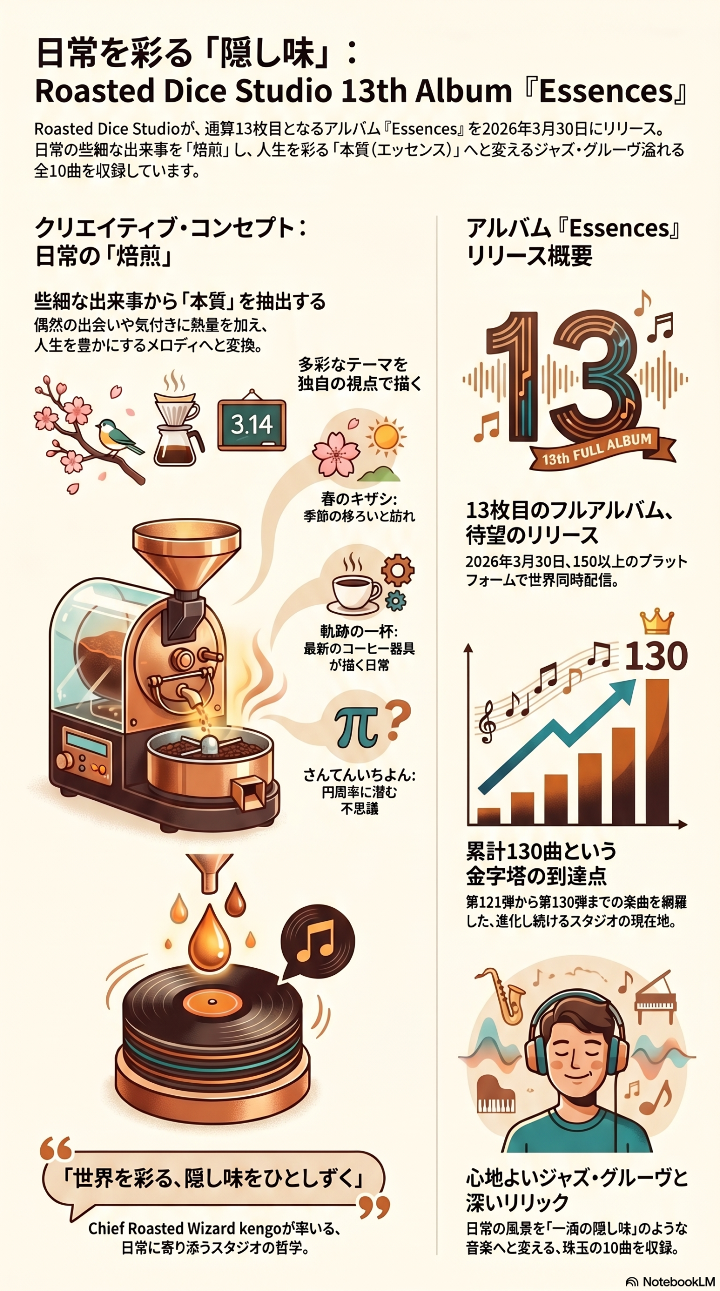 アルバム全体を俯瞰したとき、学習者が辿り着く最大の気づきは、**「人生という作品において、無駄な素材(エッセンス)など一つも存在しない」**という事実です。Roasted Dice Studioが130曲の積み重ねを経て提示する「究極の結論」を、自らの人生を設計するヒントとして受け取ってください。