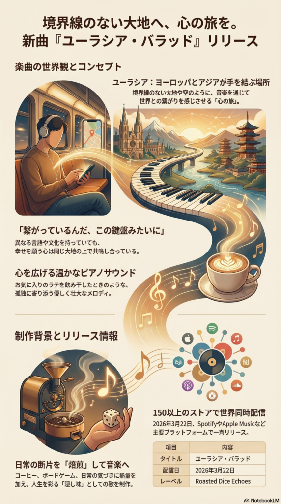- ラテの余韻: お気に入りのラテを飲み干した後の、ふわりと心が広くなる感覚。 これら具体的な手触りや温度感が、「広大なユーラシア」という大きなテーマを、聴き手の日常の中に着地させます。