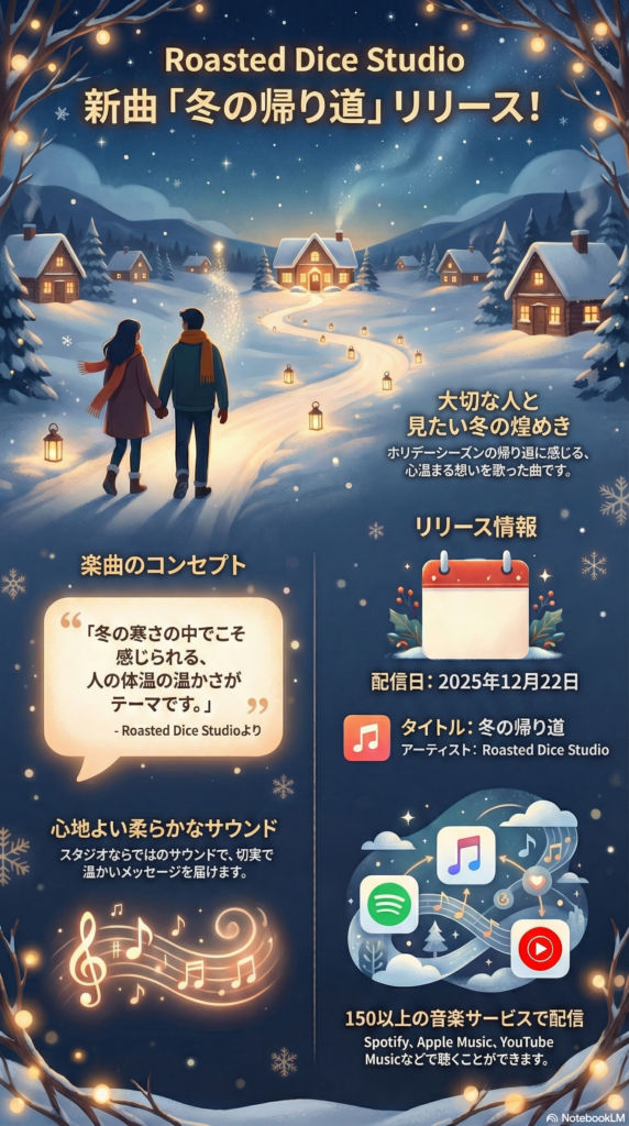 この楽曲は、Roasted Dice Studioが積み重ねてきた創作の歴史の中で、実に98作目の配信シングルとして産声を上げました。ホリデーシーズンの華やぎに満ちた街並みを舞台にしながら、本作が描き出すのは外側の煌びやかさだけではありません。寒さの中でこそ切実に感じられる「誰かの体温」や「心の繋がり」という、目に見えない温もりへの期待感。耳を傾けるほどに、聴き手の日常に寄り添い、凍えた心に明かりを灯してくれるような一作となっています。