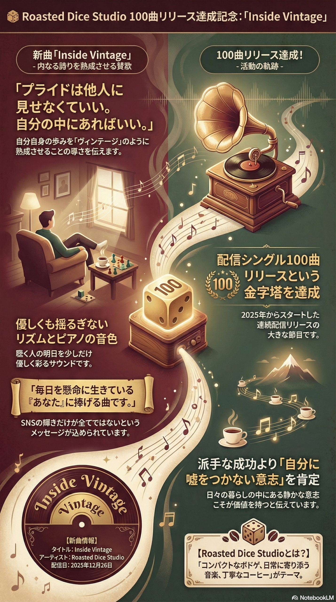 この「Inside Vintage」は、Roasted Dice Studioにとって単なる新曲ではありません。2025年から始まった連続配信リリースが、ついにたどり着いた「記念すべき第100弾配信シングル」なのです。100曲という道のりそのものが、まさに時間をかけて熟成された「ヴィンテージ」であり、この楽曲は彼ら自身の歩みを体現しているのです。