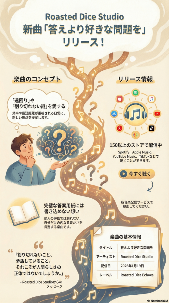 「答えより、好きな問題を」。このタイトルが投げかける問いに、思わず立ち止まってしまった方も多いのではないでしょうか。現代社会は、あらゆる場面で「最短距離」や「効率」を求めます。しかし、Roasted Dice Studioの最新シングルである本作は、そんな時代に逆らうかのように、あえて「遠回り」することの愛おしさや、すぐに解けない「謎」を抱きしめることの豊かさを、私たちに優しく語りかけてくれます。