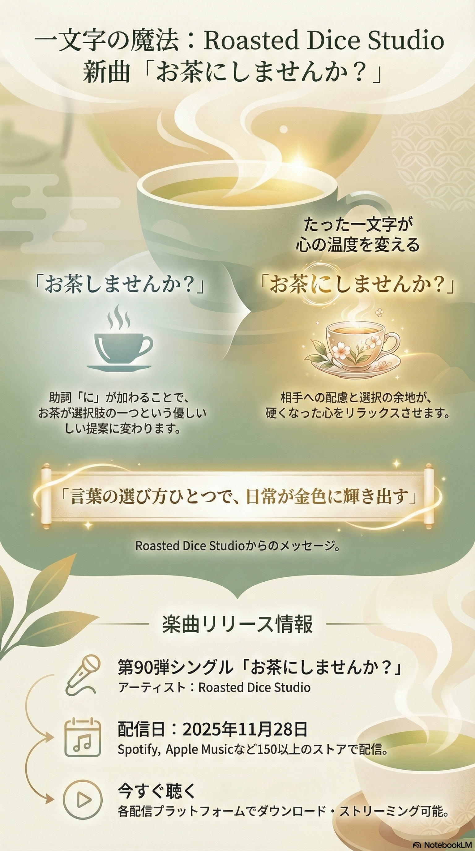 Roasted Dice Studioの「お茶にしませんか?」は、単なる音楽作品ではありません。それは、私たちの日常のコミュニケーションにおける「相手への配慮」と「心の温度」の大切さを、優しく教えてくれる一編の詩のような作品です。