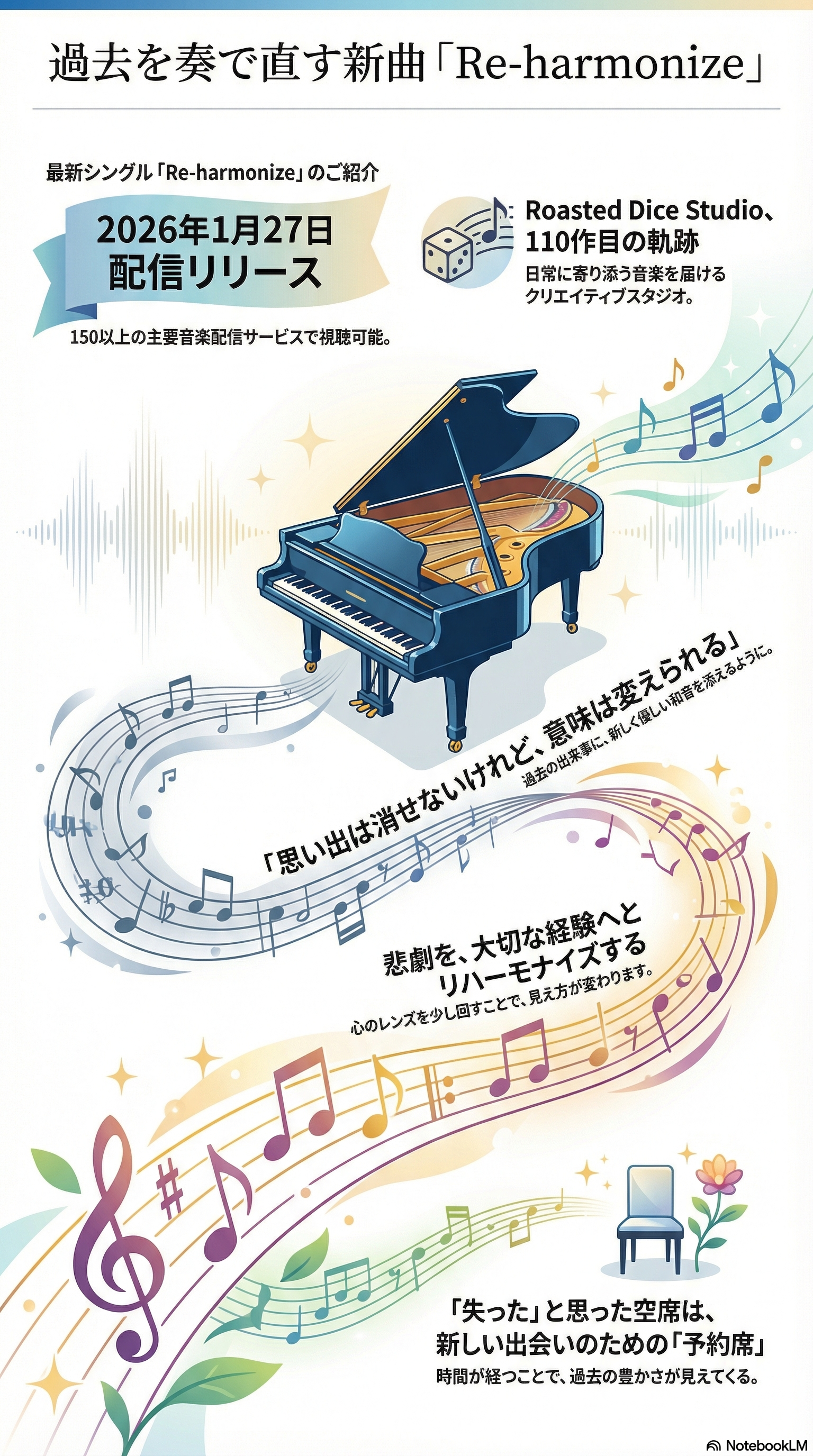 Roasted Dice Studioが110作目の節目にリリースするシングル「Re-harmonize」。この楽曲は、私たちの誰もが抱える過去の思い出に対して、あたたかな光を当てるような作品です。中心にあるのは、「思い出は消せないけれど、意味は変えられる」という、シンプルでありながら深く心に響くメッセージ。辛かった経験も、寂しかった別れも、その事実自体を消し去ることはできません。しかし、今の私たちがどう捉えるかで、その思い出が持つ意味合いは、まるで色を変えるように変化していくのです。このポジティブな人生観が、洗練されたピアノと優しいメロディによって描き出されています。