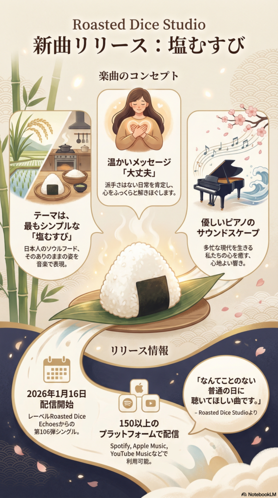 情報が溢れ、時間に追われる毎日。気づけば心が少し疲れてしまっている、と感じることはありませんか。そんな現代を生きる私たちに、そっと寄り添う一曲が誕生しました。Roasted Dice Studioが第106弾配信シングルとして2026年1月16日にリリースする最新シングル「塩むすび」は、日々の喧騒の中で忘れてしまいがちな、ささやかで温かな時間を思い出させてくれる作品です。