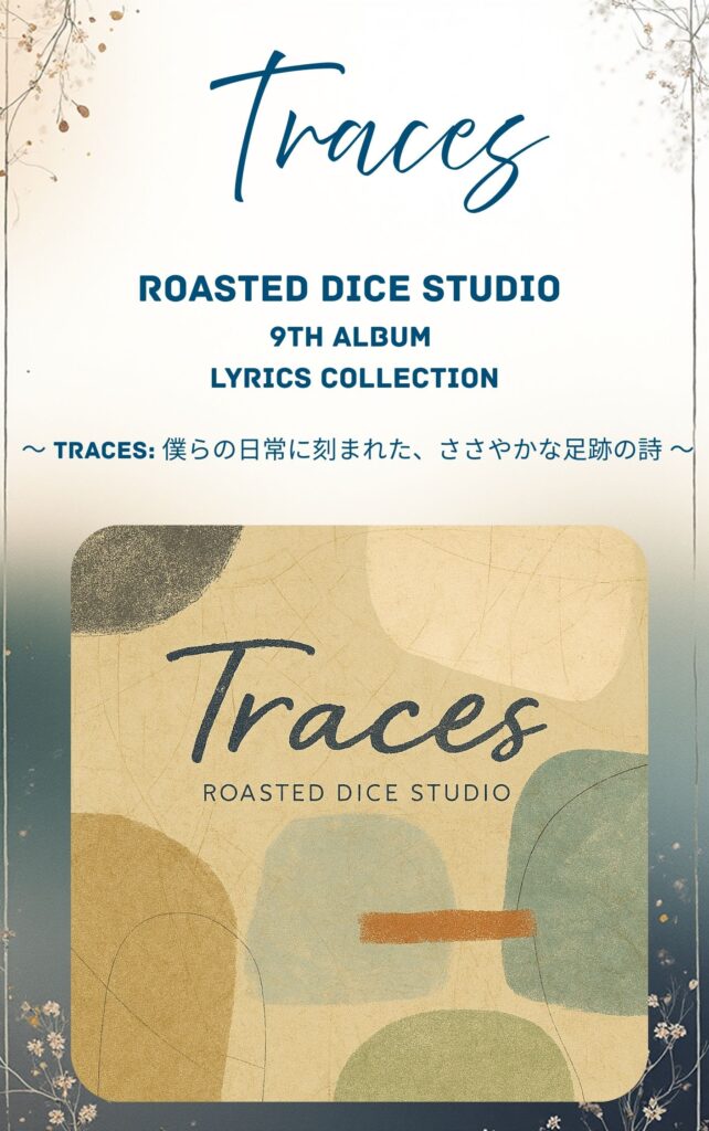 Chief Roasted Wizard kengoが主宰するクリエイティブスタジオ、Roasted Dice Studioは、最新9thアルバム『Traces』の公式歌詞集、『Traces Roasted Dice Studio 9th Album Lyrics Collection: 〜 Traces: 僕らの日常に刻まれた、ささやかな足跡の詩 〜』をAmazon Kindleにてワンコイン500円(税込)で配信開始しました。