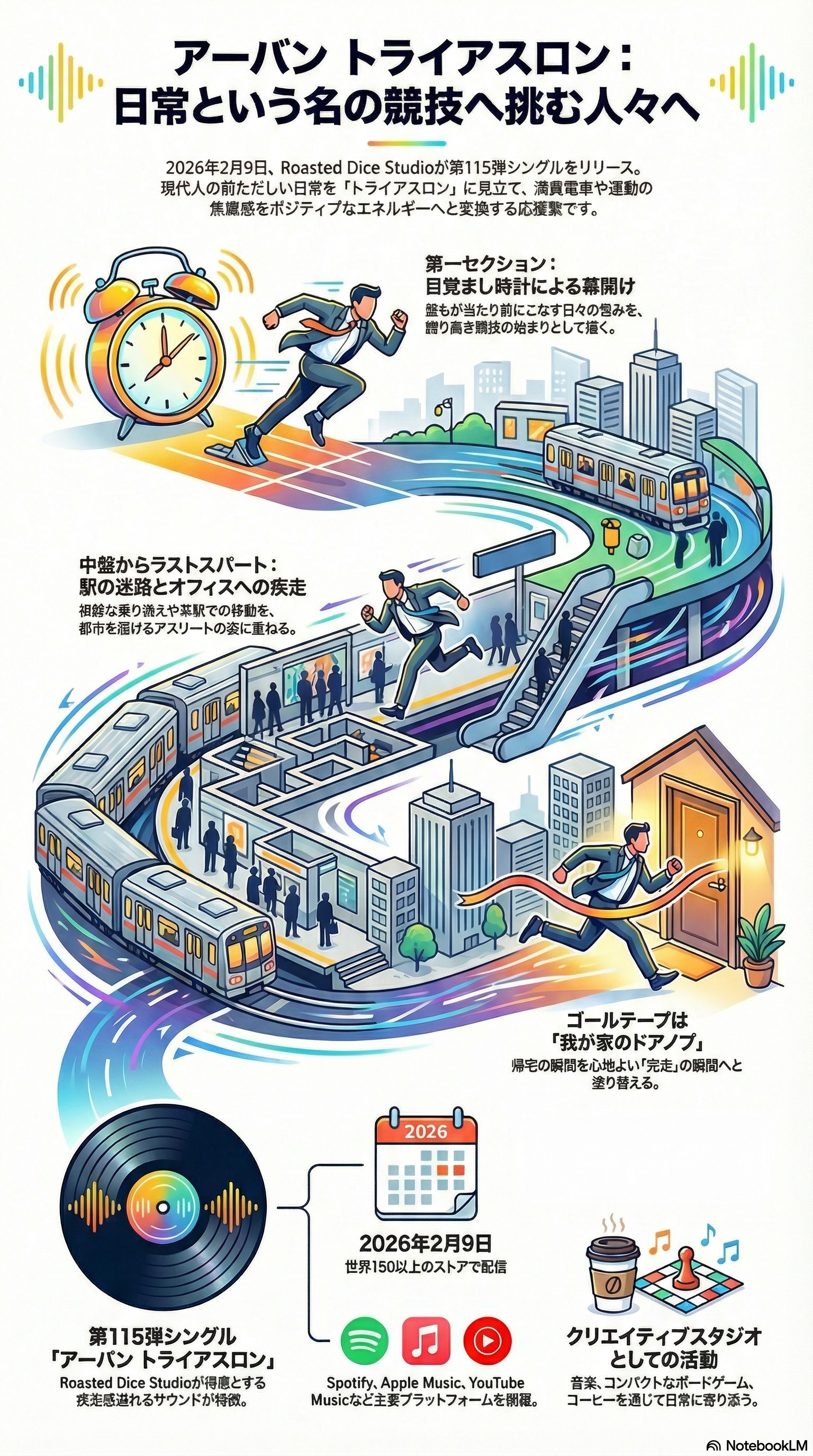 本ガイドの目的は、クリエイティブスタジオ Roasted Dice Studio が放つ第115弾配信シングル『アーバン トライアスロン』を題材に、一見すると無機質な日常を、誇り高き「競技(アスレチック・イベント)」へと書き換えるコンセプトデザインの技法を習得することです。